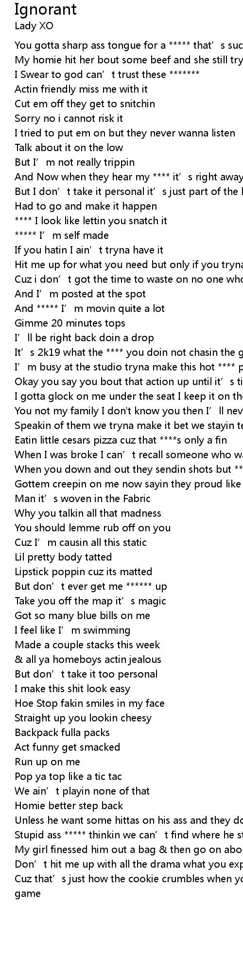 | [00:23.04] | You gotta sharp ass tongue for a ***** that’s suckin **** |