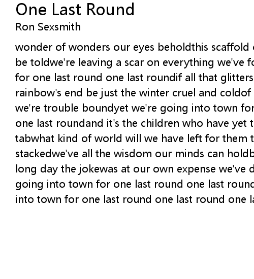wonder of wonders our eyes beholdthis scaffold of stars but look under for truth be toldwe're leaving a scar on everything we've foundand we're going into town for one last round one last roundif all that glitters is not goldshould our rainbow's end be just the winter cruel and coldof our discontent my friends we're trouble boundyet we're going into town for one last round one last round one last roundand it's the children who have yet to come who'll have to pay our tabwhat kind of world will we have left for them the odds now will be stackedwe've all the wisdom our minds can holdbut no common sense all the live long day the jokewas at our own expense we've drained our bottles downand we're going into town for one last round one last round one last roundyes we're going into town for one last round one last round one last round |