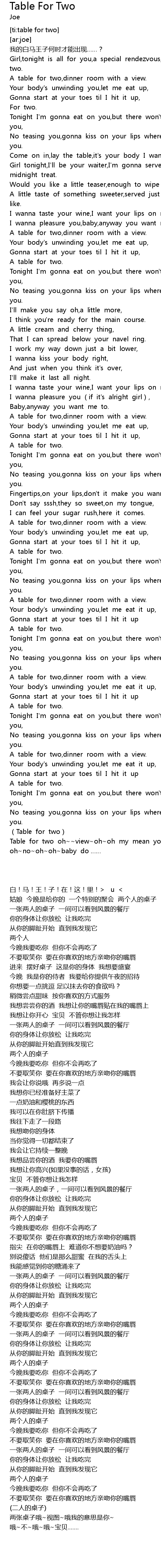 | [00:11.81] | Girl,tonight is all for you,a special rendezvous,table for two. |