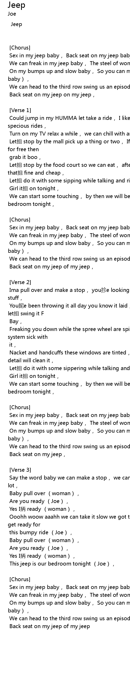 | Sex in my jeep baby, Back seat on my jeep baby baby baby, | |