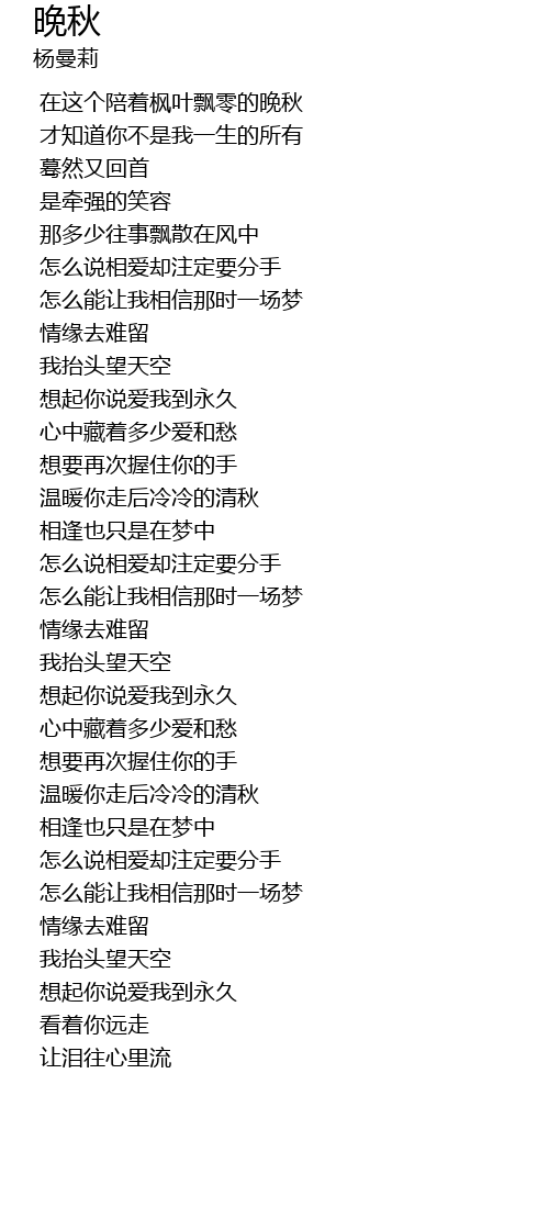 | [00:32.899] | 在这个陪着枫叶飘零的晚秋 |