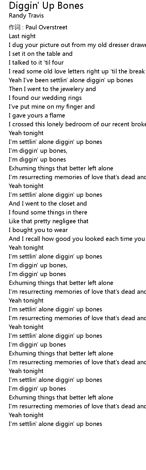 | I'm settlin' alone diggin' up bones |