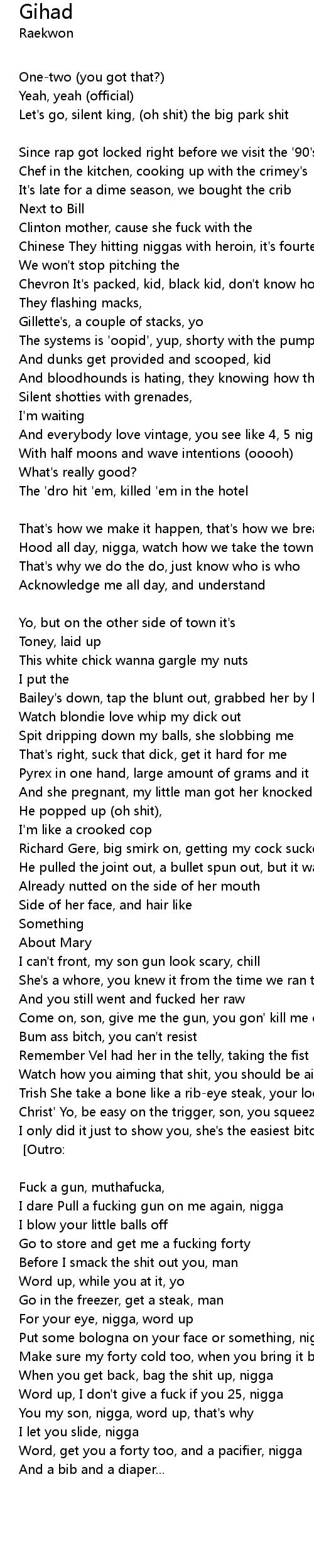 He came close, had to duff him, nigga, give me that shit [Chorus] [Outro: Ghostface Killah] |