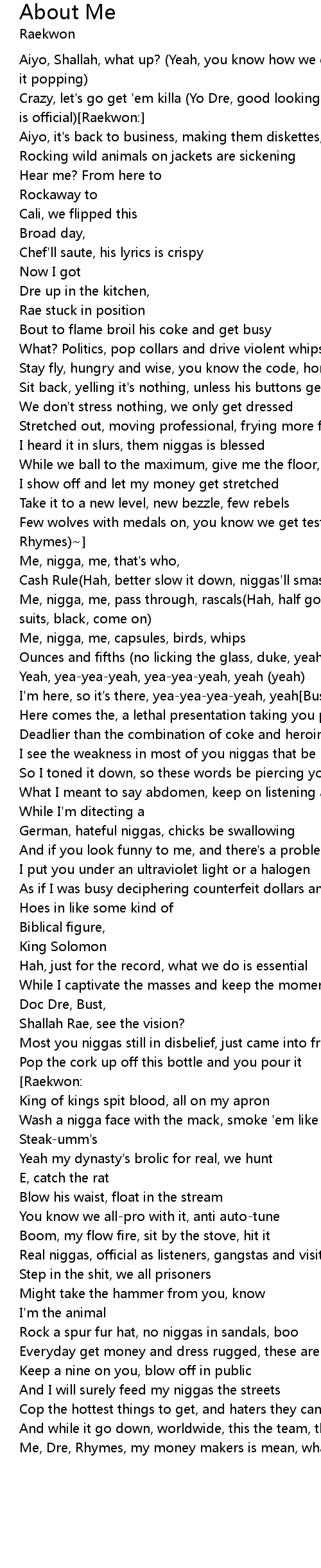 Crazy, let's go get 'em killa (Yo Dre, good looking on this coke, man)(This shit is official)[Raekwon:] |