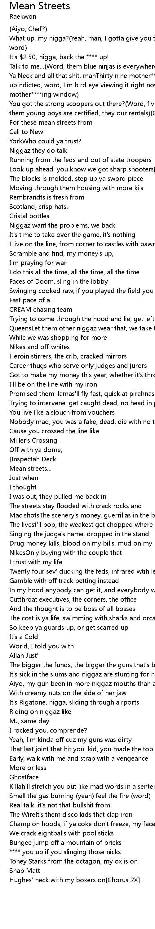 Talk to me...(Word, them blue ninjas is everywhereWord, watch ya back, Protect Ya Neck and all that shit, manThirty nine mother****ers already got scooped upIndicted, word, I'm bird eye viewing it right nowOut there out the mother****ing window) |