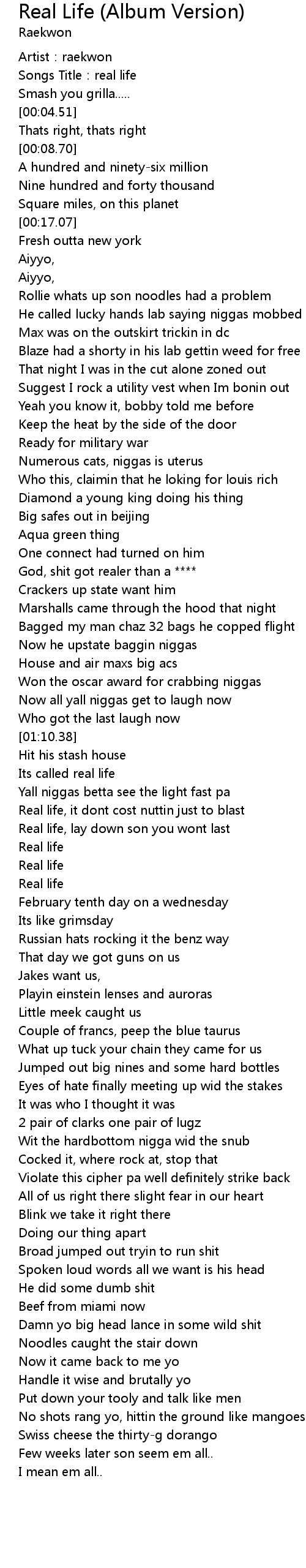 | [01:15.38] | Real life, it dont cost nuttin just to blast |