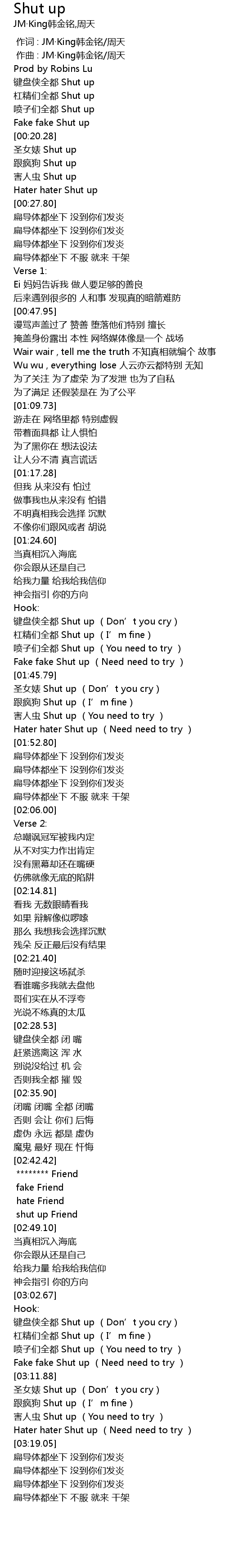 | [03:08.43] | 喷子们全都 Shut up (You need to try ) |
