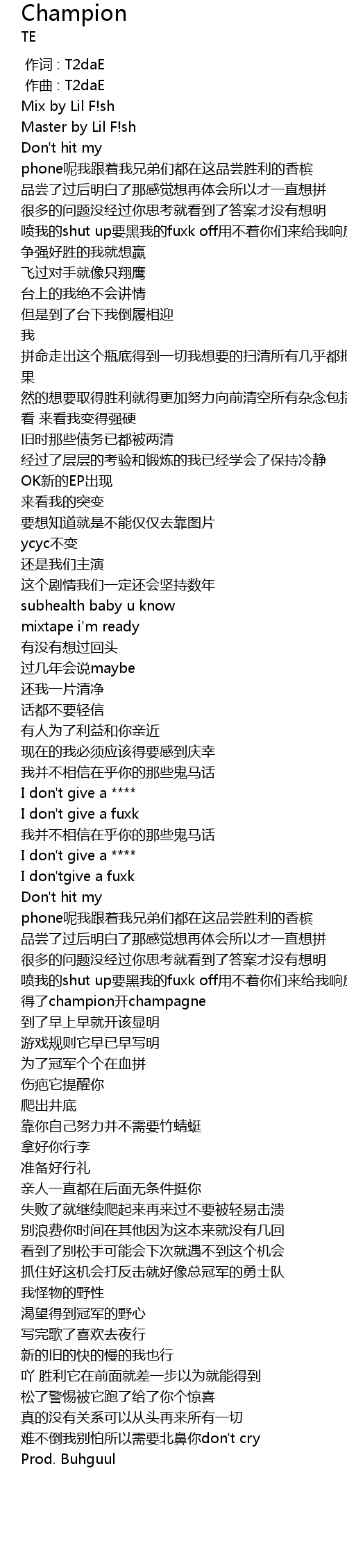 | [01:19.766] | Don't hit my phone呢我跟着我兄弟们都在这品尝胜利的香槟 |