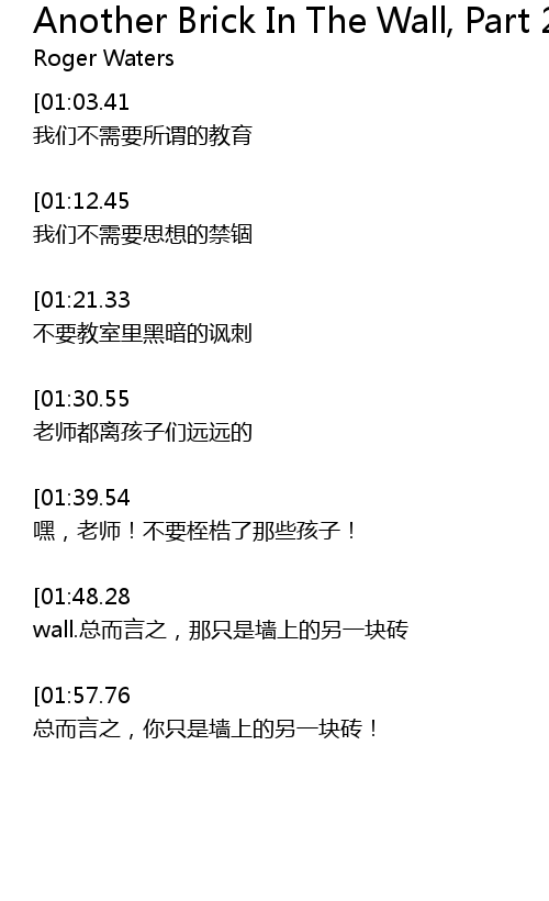 | [05:14.80][01:48.28][00:45.22] | All in all it's just another brick in the wall.总而言之,那只是墙上的另一块砖 |