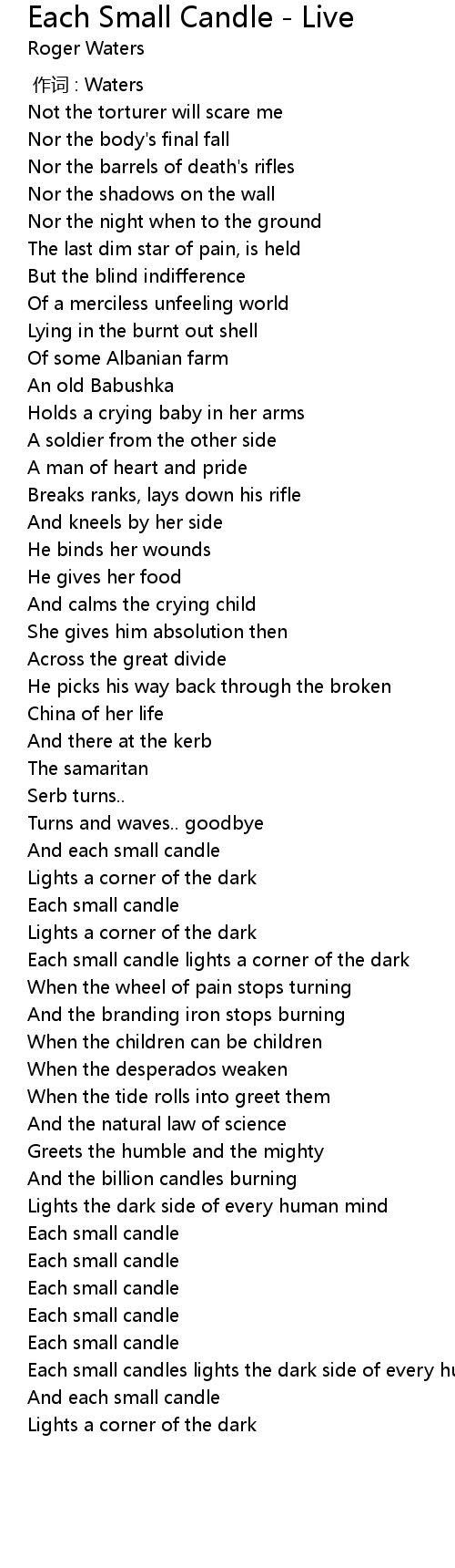 | [04:52.73] | Each small candle lights a corner of the dark |