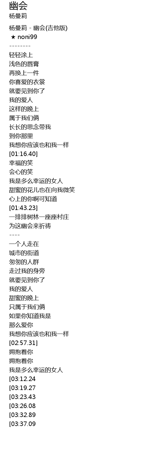 | [00:03.00] | 杨曼莉 - 幽会(吉他版) |