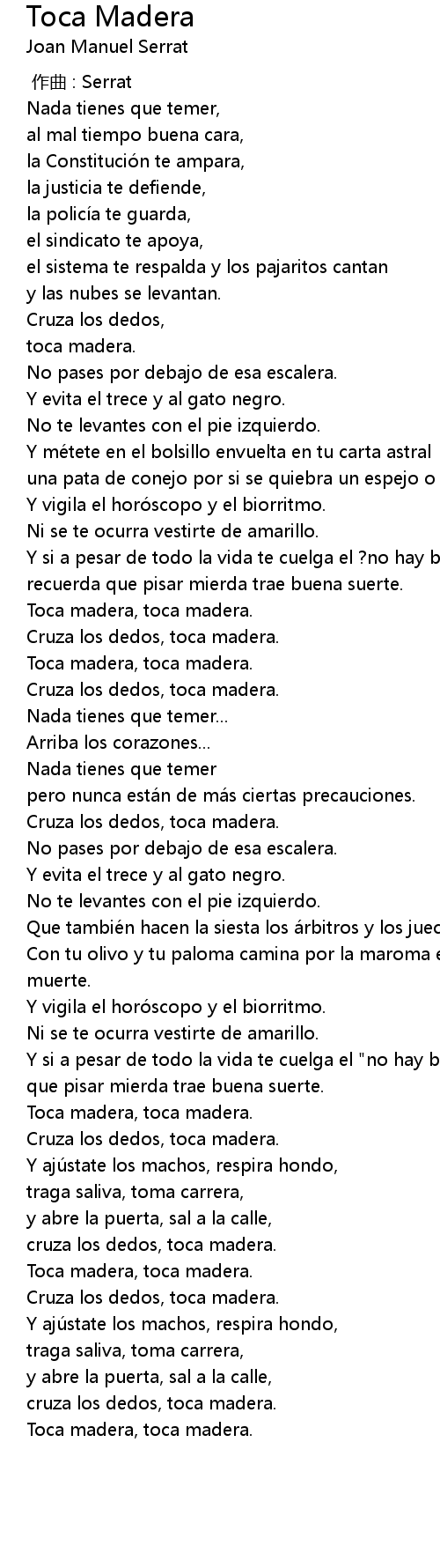 | [04:00.56] | Toca madera, toca madera. |