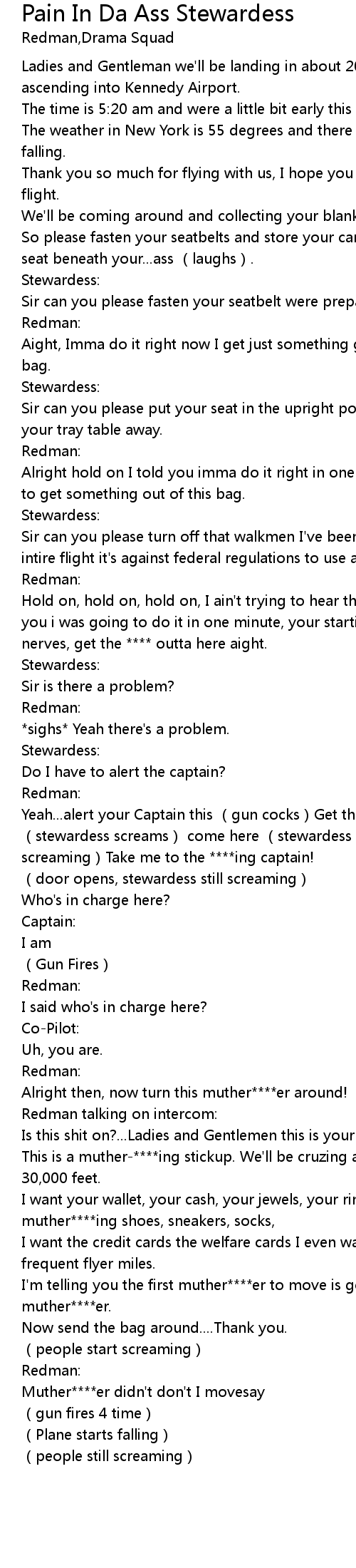 | [01:04.73] | stewardess screams come here stewardess still screaming Take me to the ing captain! |
