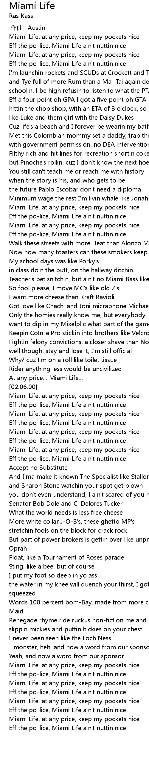 | [03:26.43] | Eff the police, Miami Life ain' t nuttin nice |
