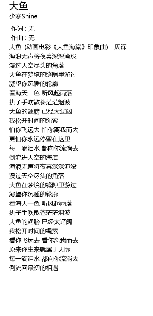 | [00:47.109] | 大鱼-(动画电影《大鱼海棠》印象曲) - 周深 |