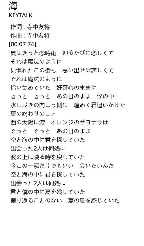 | [01:56.19] | 空と海の中に君を探していた |