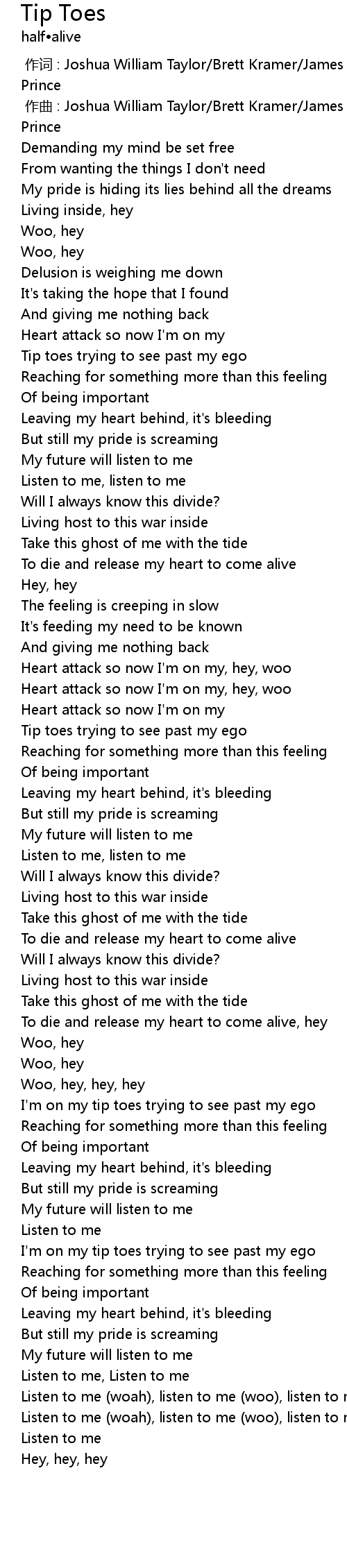 | [00:01.000] | zuo qu : Joshua William Taylor Brett Kramer James Krausse Austin Prince |