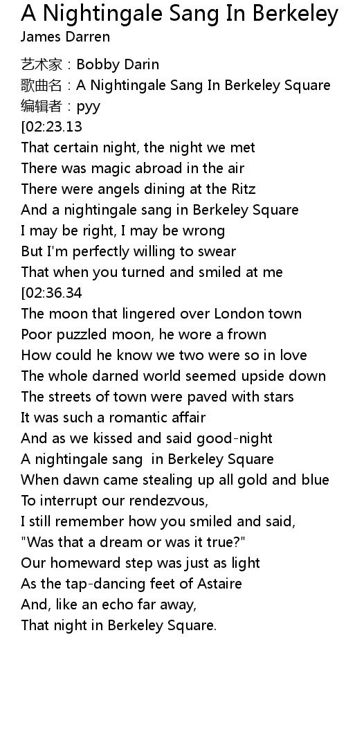 | [02:40.48][02:36.34][00:48.89] | A nightingale sang in Berkeley Square |