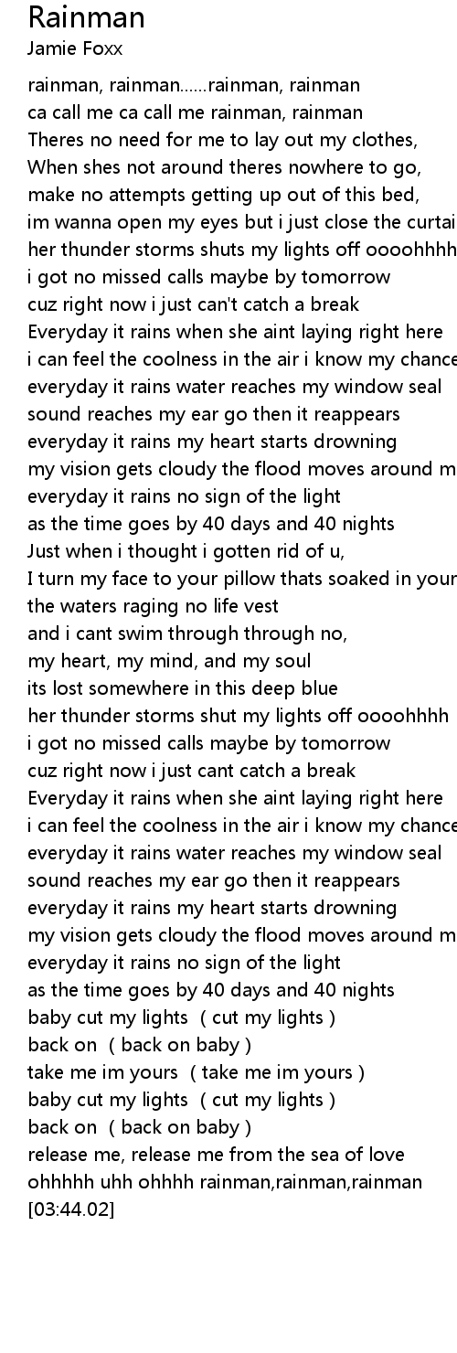 | [03:26.64] | ohhhhh uhh ohhhh rainman, rainman, rainman |