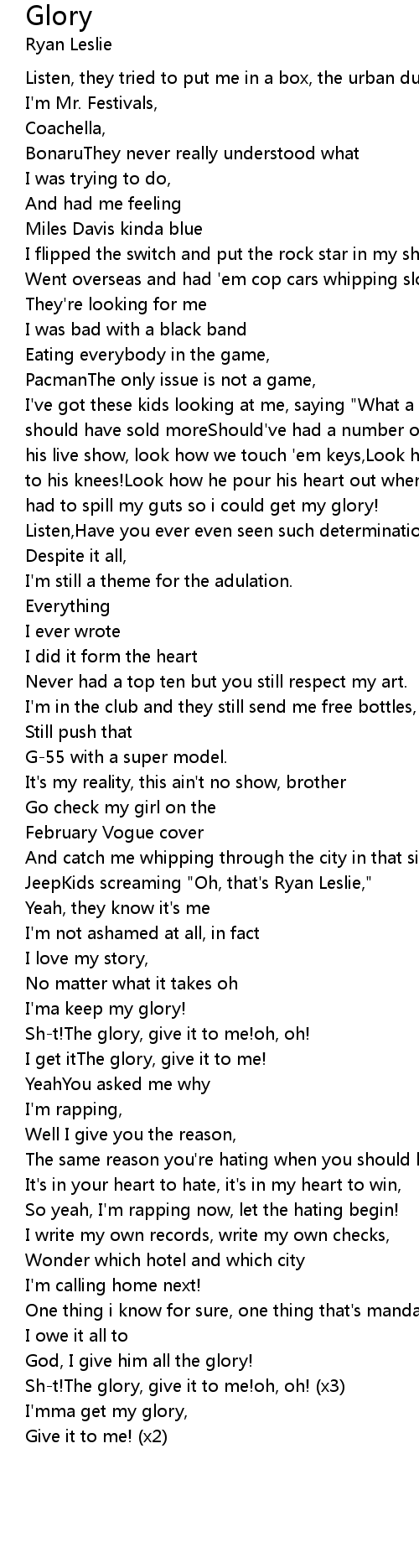 I've got these kids looking at me, saying "What a shame!He's so underrated, he should have sold moreShould've had a number one record with his own tour.Look at his live show, look how we touch 'em keys,Look how 'em girls scream when he fall to his knees!Look how he pour his heart out when he tell his story."i guess i had to spill my guts so i could get my glory! |
