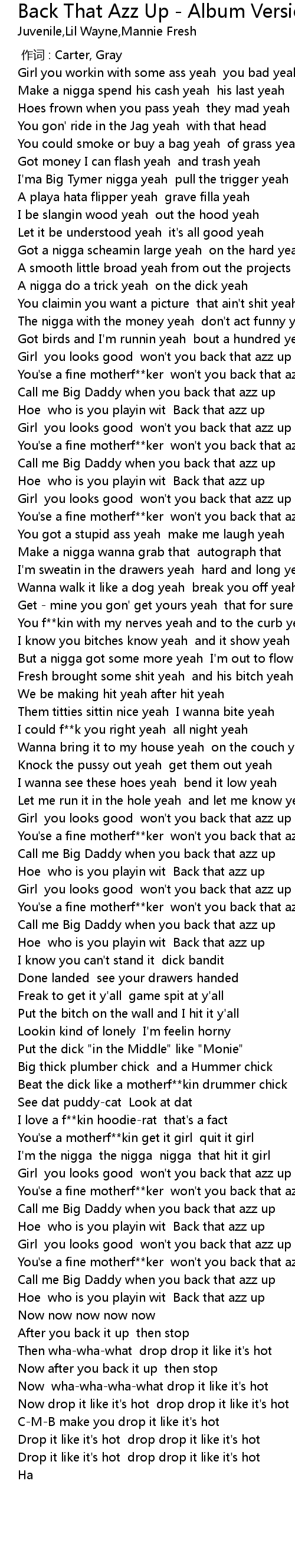 | [03:04.42] | You'se a fine motherf**ker won't you back that azz up |