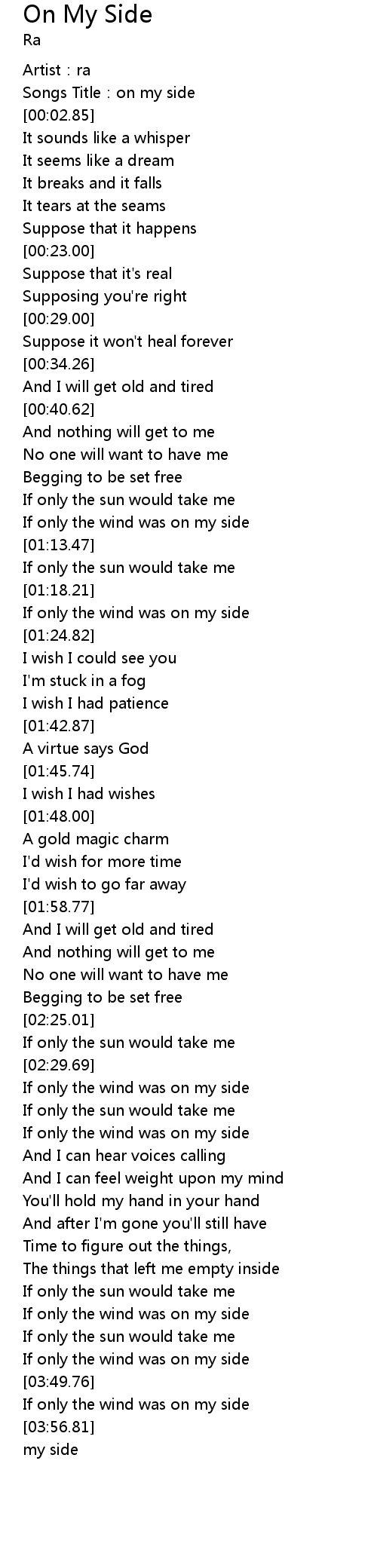 | [03:24.99] | If only the wind was on my side |
