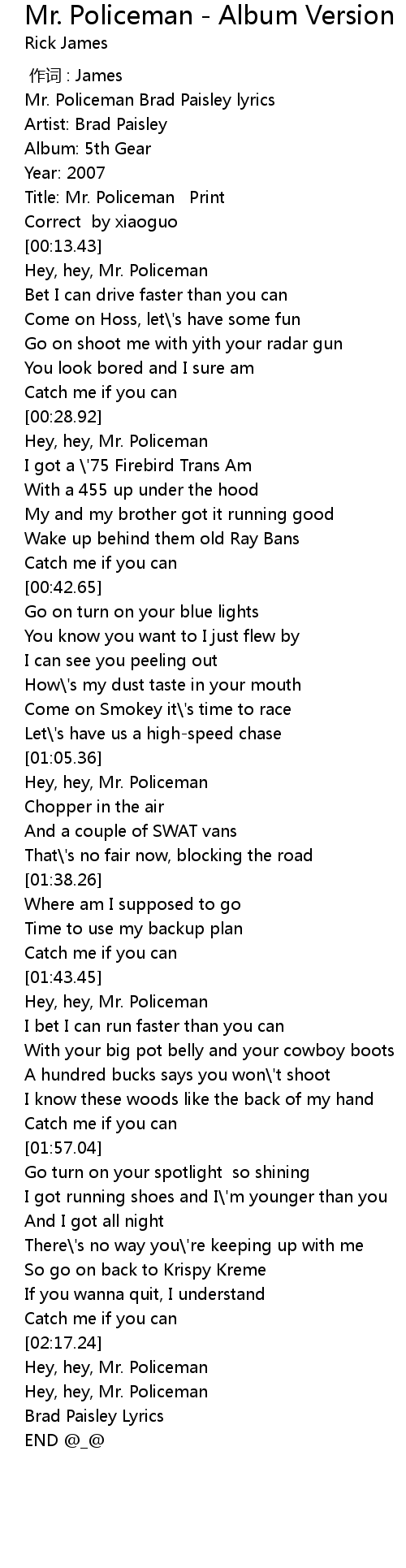 | [02:17.60] | Hey, hey, Mr. Policeman |