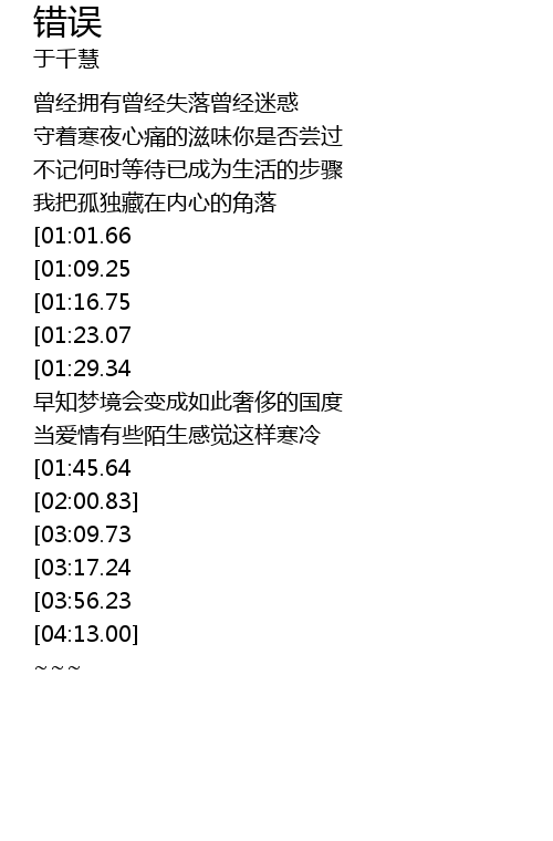 | [01:53.22][01:45.64] | wǒ cái jīng jué zǒu guò de cháng lù shì yī chǎng cuò wù |