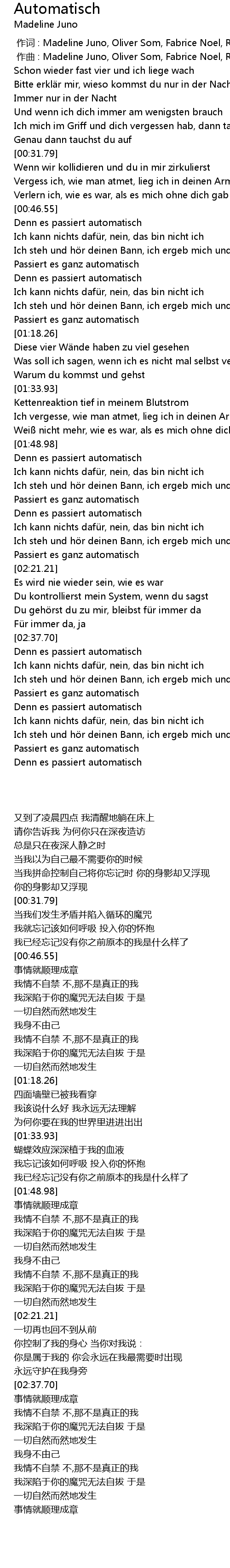 | [00:00.000] | 作词 : Madeline Juno, Oliver Som, Fabrice Noel, Rainer Rütsch |