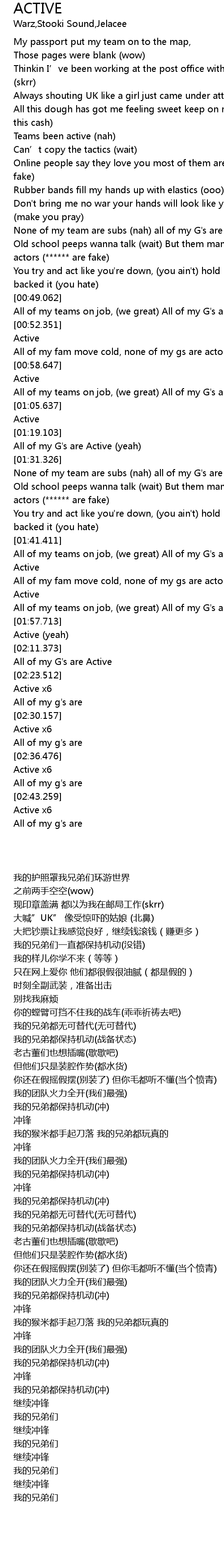 | [00:49.211] | All of my teams on job, (we great) All of my G's are Active (yeah) |