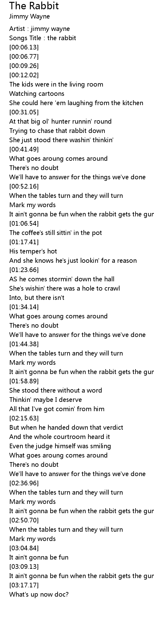 | [03:10.77] | It ain't gonna be fun when the rabbit gets the gun |
