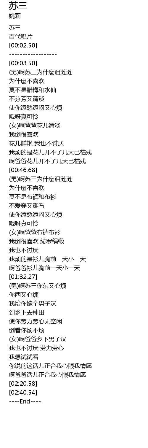 | [00:04.20] | (男)啊苏三为什麼泪涟涟 |
