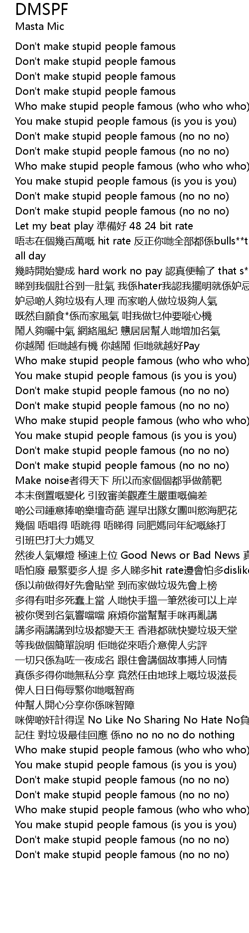 | [02:37.766] | 講多兩講講到垃圾都變天王 香港都就快變垃圾天堂 |