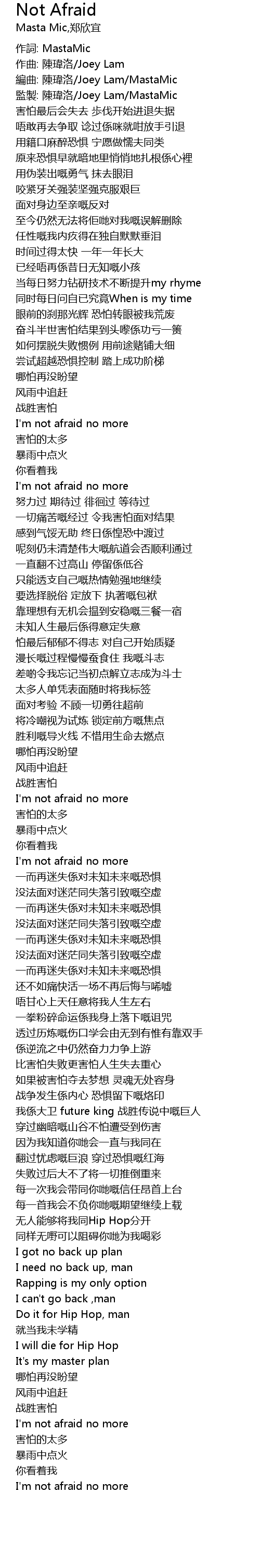| [00:20.754] | jiān zhì: chén wěi luò Joey Lam MastaMic |