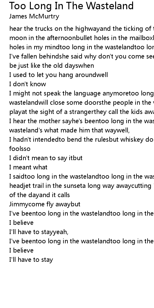 hear the trucks on the highwayand the ticking of the clockthere's a ghost of a moon in the afternoonbullet holes in the mailboxbullet holes in the mailboxkey holes in my mindtoo long in the wastelandtoo long in the wasteland |