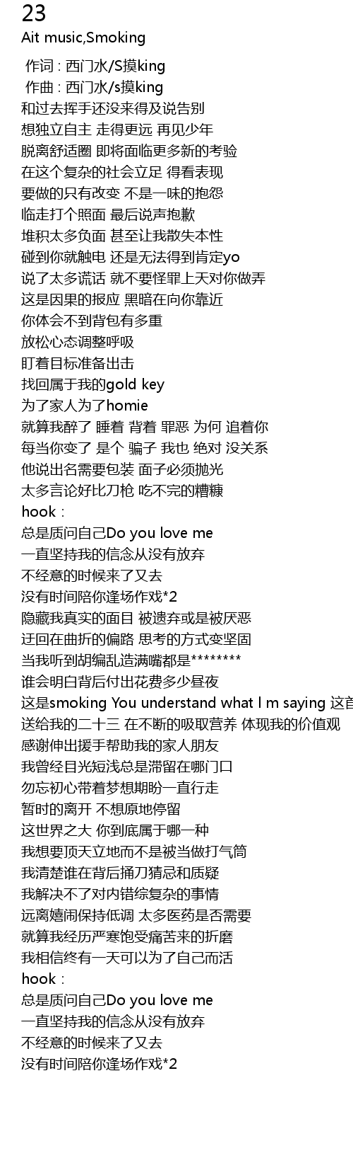 | [01:45.940] | 这是smoking You understand what l m saying 这首歌写给我自己 送给我的二十三 在不断的吸取营养 体现我的价值观 |