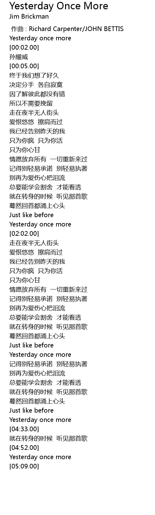 | [00:00.000] | zuò qǔ : Richard Carpenter JOHN BETTIS |