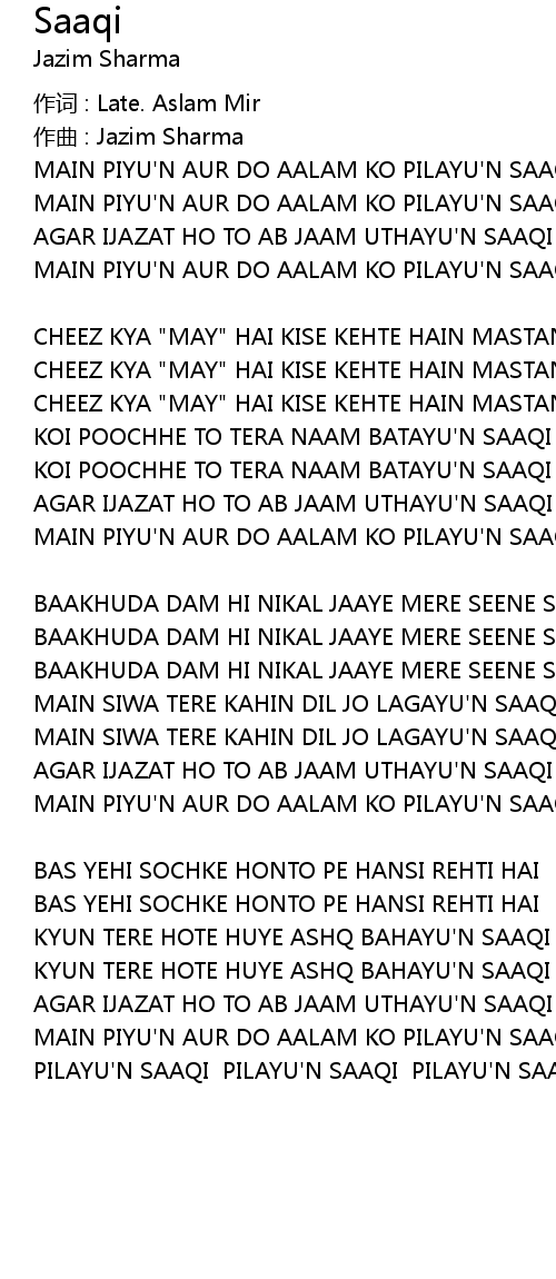 | MAIN PIYU' N AUR DO AALAM KO PILAYU' N SAAQI | |