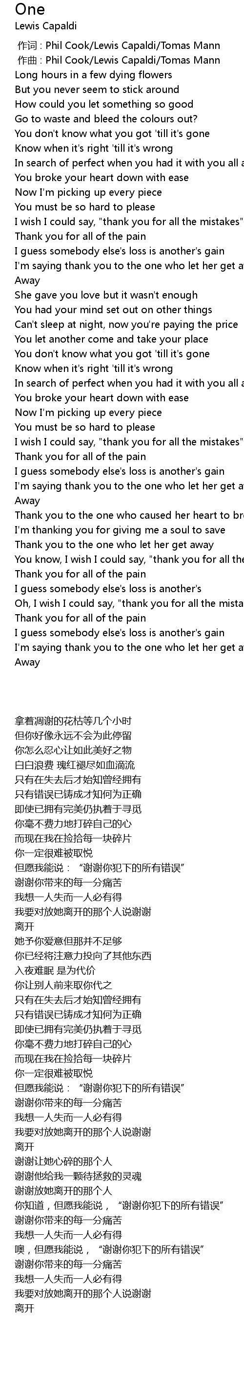| [00:00.006] | zuo qu : Phil Cook Lewis Capaldi Tomas Mann |