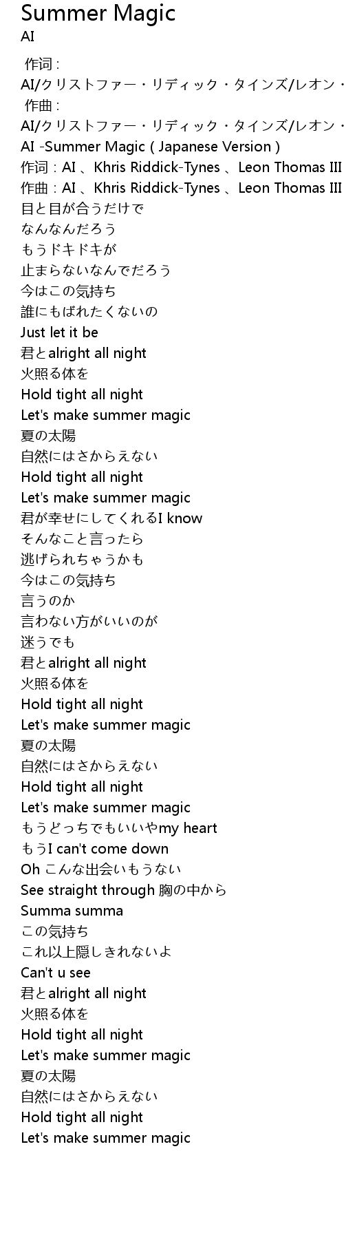 | [00:00.93] | AI -Summer Magic(Japanese Version) |