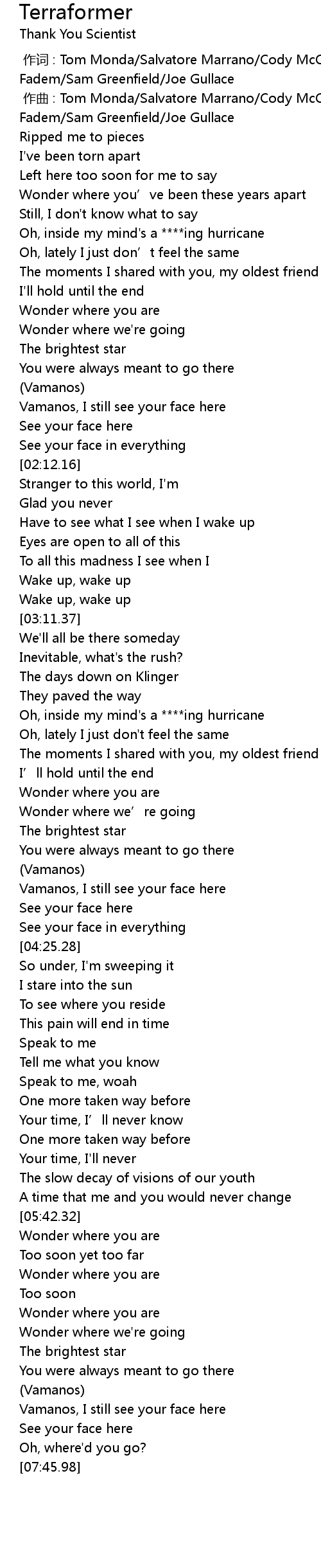 | [03:27.58] | Oh, inside my mind's a ****ing hurricane |