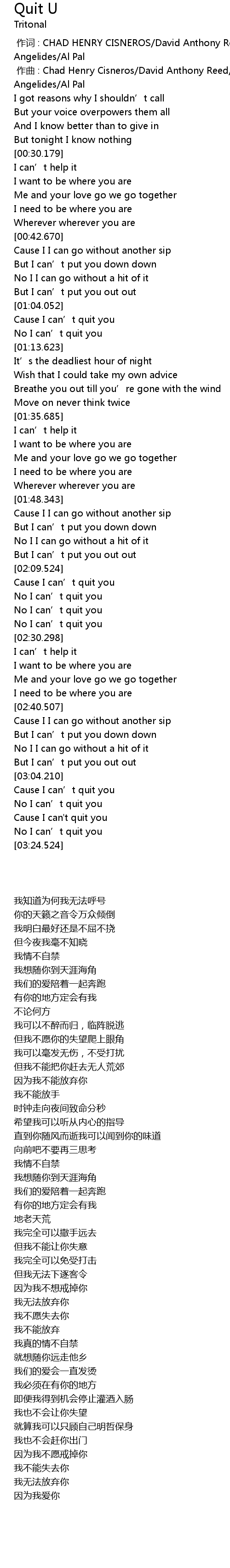 | [03:15.218] | Cause I can' t quit you |
