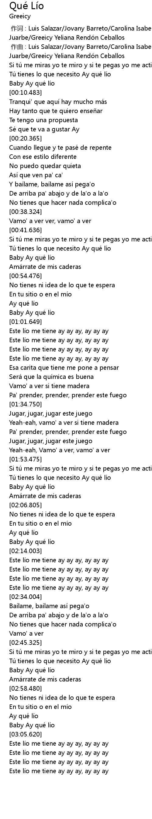 | [00:06.128] | Tú tienes lo que necesito Ay qué lío |