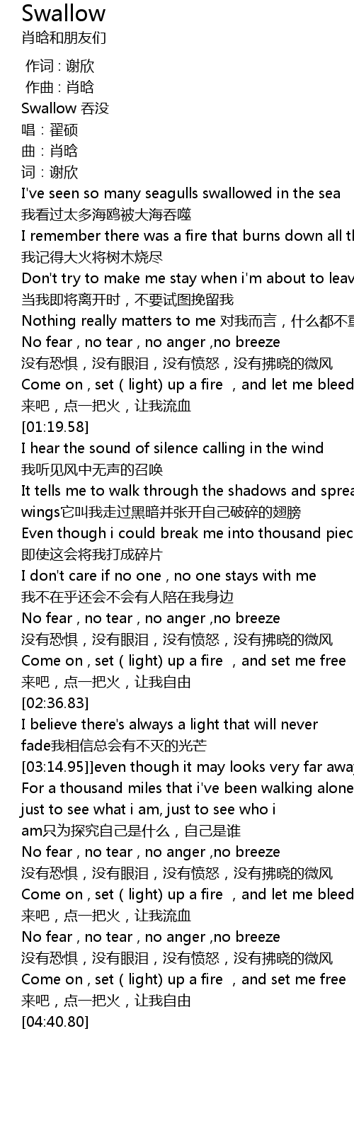 | [00:19.76] | I' ve seen so many seagulls swallowed in the sea wo kan guo tai duo hai ou bei da hai tun shi |