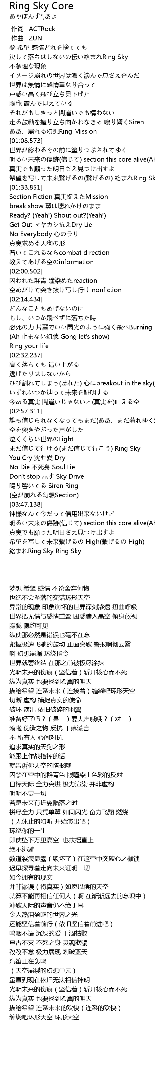 | [03:28.405] | 泣くくらい世界のLight まだ信じて行ける(まだ信じて行こう) Ring Sky |