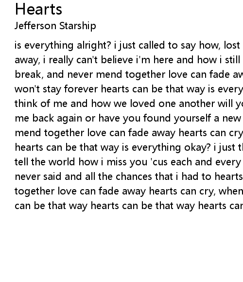 is everything alright? i just called to say how, lost i feel, without you miles away, i really can't believe i'm here and how i still care, about you hearts can break, and never mend together love can fade away hearts can cry, when love won't stay forever hearts can be that way is everything the same do you ever think of me and how we loved one another will you change your mind will you want me back again or have you found yourself a new lover hearts can break, and never mend together love can fade away hearts can cry, when love won't stay forever hearts can be that way is everything okay? i just thought i'd write a song to tell the world how i miss you 'cus each and every day i think of all the words i never said and all the chances that i had to hearts can break, and never mend together love can fade away hearts can cry, when love won't stay forever hearts can be that way hearts can be that way hearts can be.... is everything alright? |