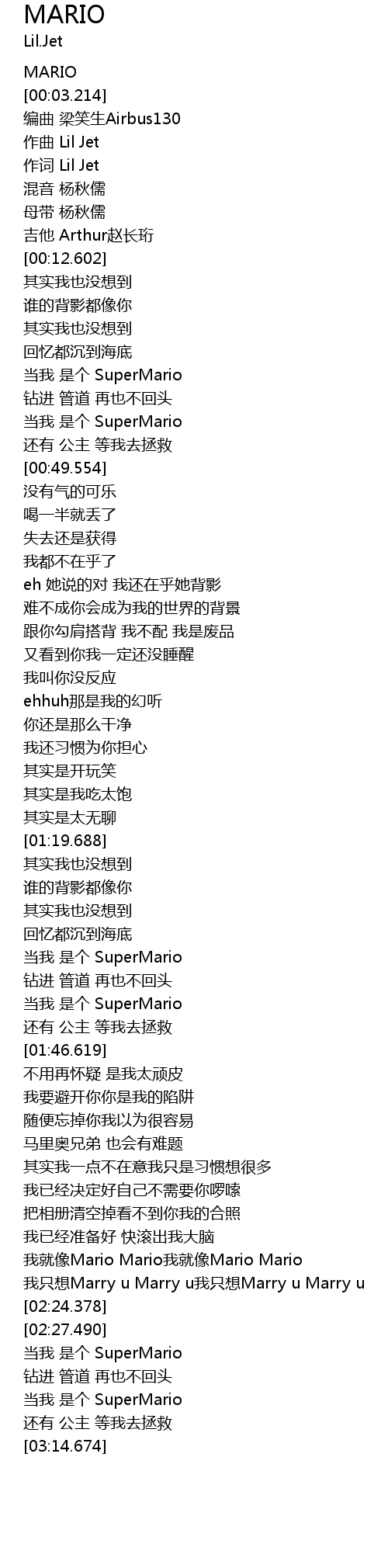 | [03:02.333] | 当我 是个 SuperMario |
