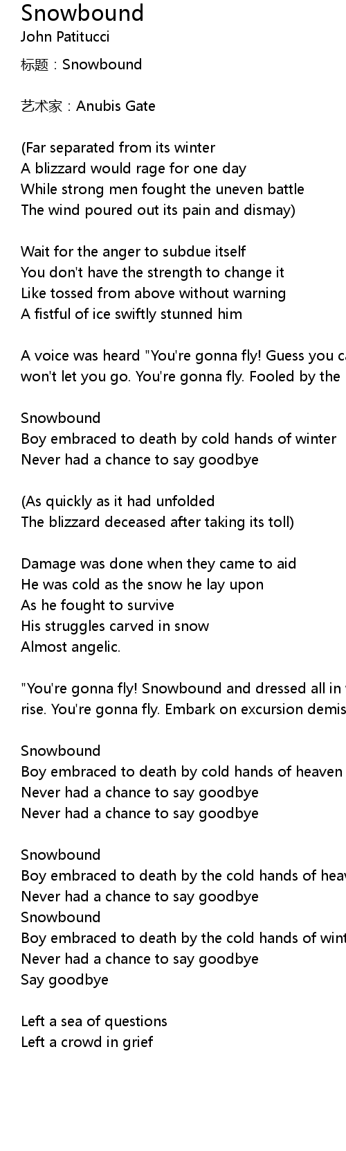 | "You're gonna fly! Snowbound and dressed all in white. But your spirit will rise. You're gonna fly. Embark on excursion demise." | |