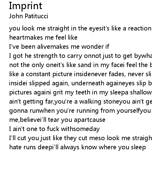 I got he strength to carry onnot just to get bywhats with you son?a fatal vision not the only oneit's like sand in my facei feel the blood drip in my eyesit's like a constant picture insidenever fades, never slips awayit stays imprinted insidei slipped again, underneath againeyes slip back into the headi see the pictures againi grit my teeth in my sleepa shallow imprint, step to the graveyou ain't getting far,you're a walking stoneyou ain't getting very farwhere you gonna runwhen you're running from yourselfyou look up to mebelieve me,believei'll tear you apartcause |