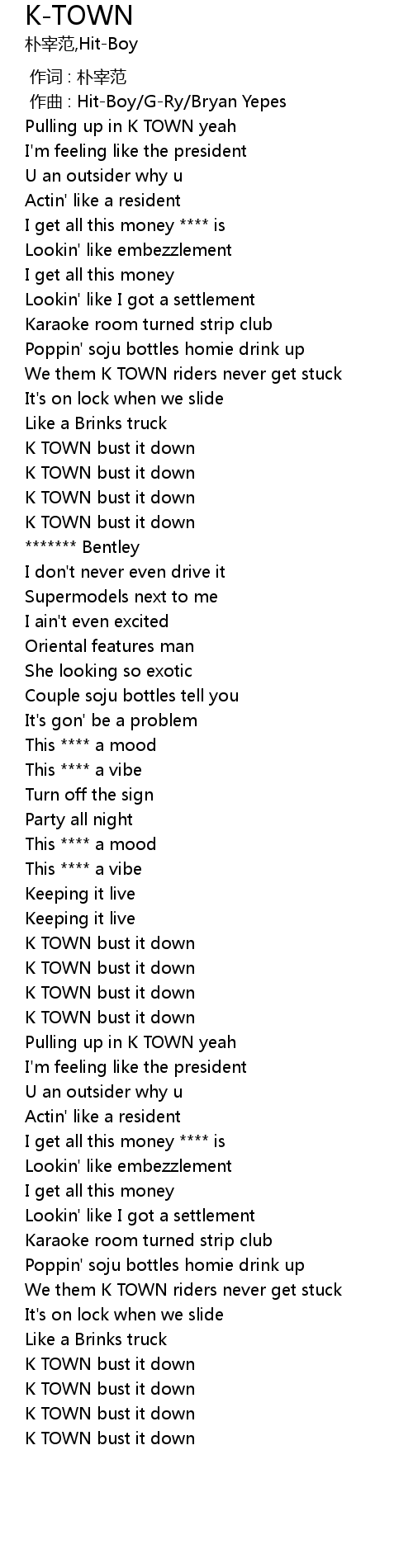 | [00:10.80] | Pulling up in K TOWN yeah |